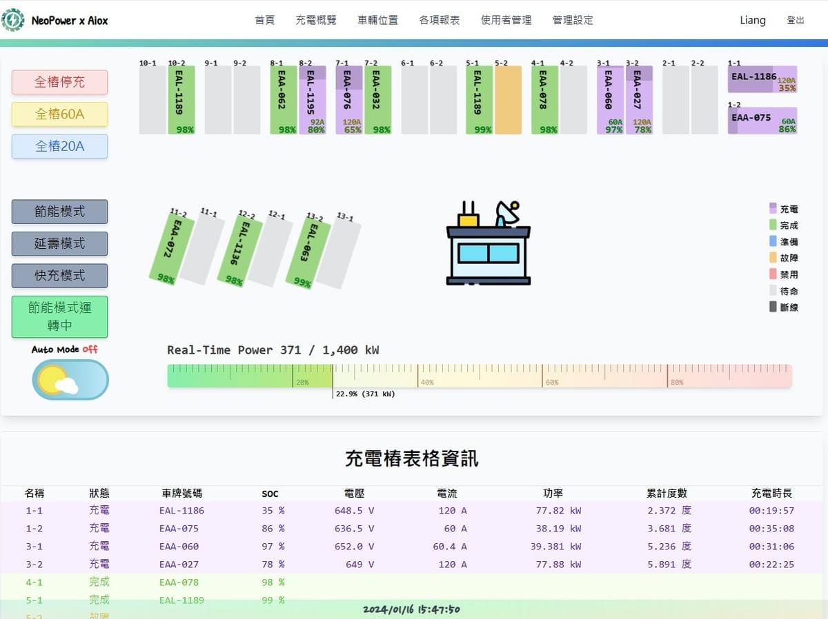 - 系統依據出車時間、目標 SOC、契約容量與電價時段,自動進行智慧充電排程與功率調度,實現削峰填谷與需量控制。